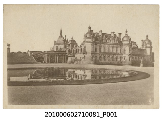 1. 本物件為尚蒂伊城堡(Chateau de Chantilly)之黑白照。後方為尚蒂伊城堡,前方有一圓形水池,中央似有栽種植物,右方清晰可見城堡倒影。2. 尚蒂伊城堡(Château de Chantilly)位於法國巴黎,現今為美術館。尚蒂伊城堡建於中世紀,其歷經各個領主更替,與法國歷史息息相關。