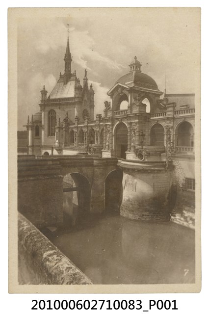1. 本物件為尚蒂伊城堡(Chateau de Chantilly)之黑白照。右方為城堡,以橋梁跨越湖泊連接到對岸。入口大門門柱有裝飾雕像及造型路燈,上方有拱門與獅子雕像。2. 尚蒂伊城堡(Château de Chantilly)位於法國巴黎,現今為美術館。尚蒂伊城堡建於中世紀,其歷經各個領主更替,與法國歷史息息相關。
