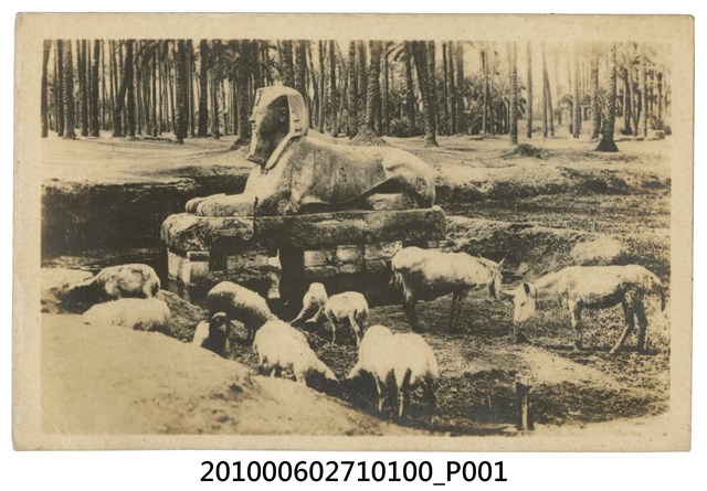 1. 本物件為埃及人面獅身像之黑白照。中央為一置於基座上的小型人面獅身像,位於一地面凹陷處,四周有正在吃草的羊隻。後方為椰棗林。2. 人面獅身像,其傳說眾多,多於古埃及時期出現,作為一種象徵。