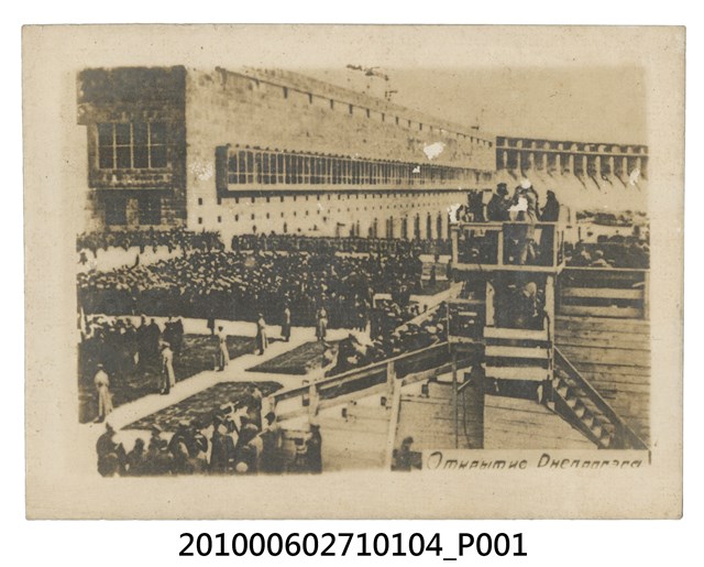 1. 本物件為第聶伯河水電站運行紀念之黑白照。第聶伯河發源俄羅斯的瓦爾代,第聶伯水電站則為第聶伯河上最大之水電站,於西元1932年啟用,有許多人到場參觀,可見著長大衣、著軍帽的軍警人員維持秩序。最右側為洩洪道,中間則是水力發電廠。照片右下方有俄文說明。2. 第聶伯河,為歐洲第三大河,其源自於俄羅斯瓦爾代丘陵南麓,流經白俄羅斯東部及烏克蘭中部,最後流入黑海聶伯灣,全長2200公里,流域面積為50.4萬平方公里,第聶伯河習慣被分為上第聶伯河與下第聶伯河。聶伯河以其水壩著名,建有克烈緬楚格、第聶伯、卡涅夫、第聶伯羅捷爾任斯克與卡霍夫卡、基輔等六座水電站。