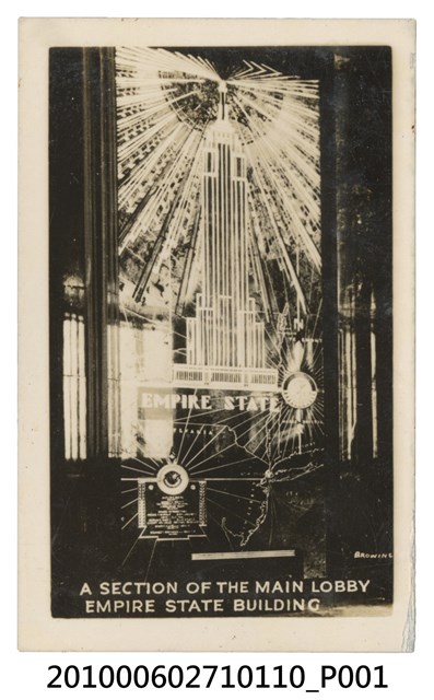 1. 本物件為紐約帝國大廈主大廳一隅之黑白照。照片體為帝國大廈大廳中的大理石裝飾畫,上方為帝國大廈,大廈頂端四射光芒,下方有「EMPIRE STATE」字樣,字的右方有一時鐘。照片下方印「A SECTION OF THE MAIN LOBBY EMPIRE STATE BUILDING」。2. 帝國大廈(Empire State Building),位於美國紐約市。於西元1931年5月1日開幕,共有102層樓高,高達381公尺,為1970年代前世界最高的建築物,而其當初的建造速度為每周超過4層樓,亦打破世界紀錄。
