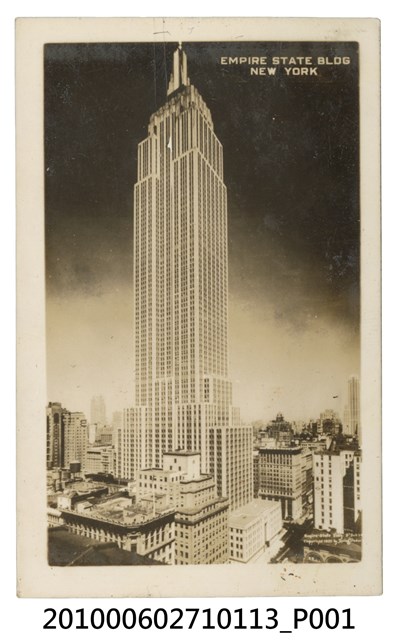 1. 本物件為紐約帝國大廈之黑白照。照片於遠方拍攝帝國大廈整體建物。照片上半部為黑色,有少許白點,推測可能為使用長時間曝光,於夜晚拍攝。照片右上方印「EMPIRE STATE BLOG NEW YORK」。2. 帝國大廈,位於紐約市中城區南部,為曼哈頓的最高樓,樓高443公尺,於西元1931年落成,曾經是世界第一高樓。