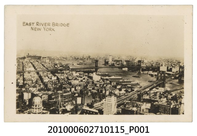 1. 本物件為紐約東河橋樑之黑白照。左方區域為曼哈頓下城區,右方為紐約東河,下方橋為布魯克林大橋,上方橋為曼哈頓大橋。照片左上方印「EAST RIVER BRIDGE NEW YORK」。2. 布魯克林大橋(Brooklyn Bridge),舊稱為東河大橋,位於紐約市,橫跨曼哈頓與布魯克林的橋樑。由建築師Roebling,John A.與Roebling,Washington A.建造,西元1883年完成通車。