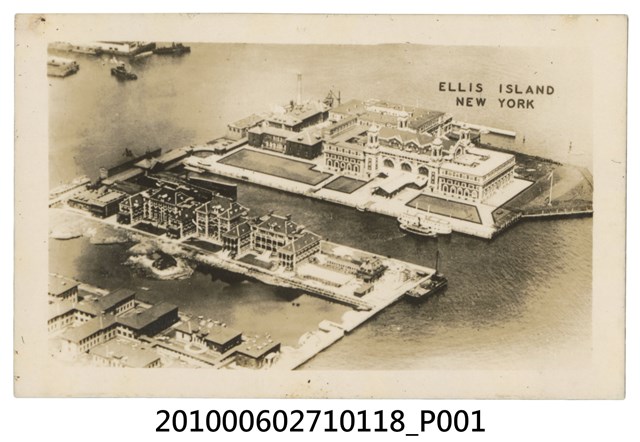 1. 本物件為埃利斯島之黑白照。埃利斯島與與自由島相鄰,右島上似城堡型建物為移民管理局。左島上亦有建物。照片右上方印「ELLIS ISLAND NEW YORK」。2. 埃利斯島(Samuel Ellis),位於美國紐約州,為西元1785年買下的島嶼,因造陸擴增其面積。1892年聯邦政府在此設立移民事務處理機構,1900年代建造法國文藝復興式的建築移民管理局以處理更繁忙的移民事務,而現今移民管理局改為移民博物館並對外開放。