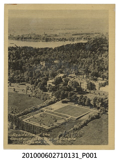 本物件為加拿大總督府之黑白照。照片中的加拿大總督府為由後方拍攝,總督府四周有許多樹木與大片草皮。照片左下角印「Residence of the Governor General of Canada Ottawa, Can. 28.」。