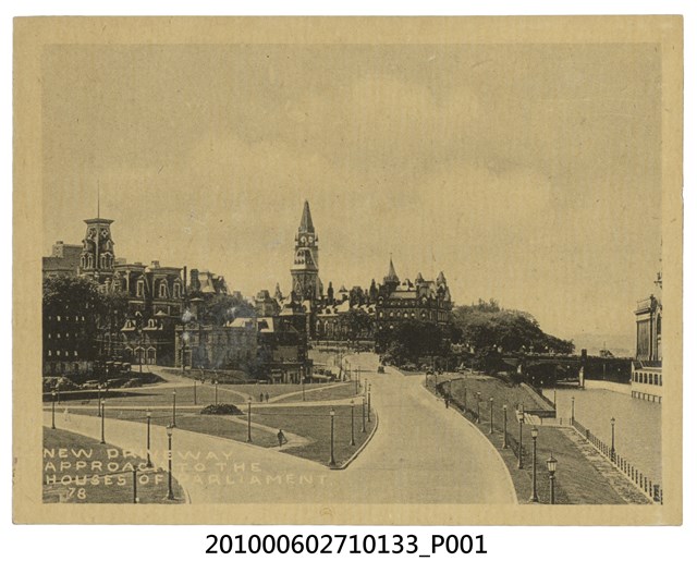 1. 本物件為通往國會山莊的新車道之黑白照。照片中央為嶄新平坦的新道路,道路兩旁設有路燈,右方為麗都運河。新道路分為兩條,右側可至國會山莊,左方可見市政廳。照片左下方印「NEW DRIVEWAY APPROACH TO THE HOUSES OF PARLIAMENT. 78」。2. 國會山莊,位在渥太華的石灰石峭壁上,有幾幢新歌德式的建築物,為國家級的建築物,是加拿大國會建築群所在位置。此建築群是以英國議會和新的威斯敏斯特宮為範本,為哥德式復古建築。