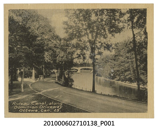 1.本物件為沿渥太華自治領車道之麗都運河之黑白照。車道與麗都運河平行,兩䢌種有大樹。麗都運河河岸亦有樹木,前方有一橫越麗都運河的橋樑。照片左下四印「Rideau Canal, along Dominion Driveway Ottawa, Can. 29.」。2.麗都運河,位於加拿大渥太華和京士頓的運河。是專為蒸汽船設計的運河之一,而另一特色是防禦工事。西元1826年,在運河建造初期,英國人採用「靜水」技術,避免了大量挖掘工作。麗都運河建造於19世紀初,途徑至今保持不變,且絕大多數原始構造完好無損的運河,且見證了為控制北美大陸發起的戰爭,具有重要的歷史價值。