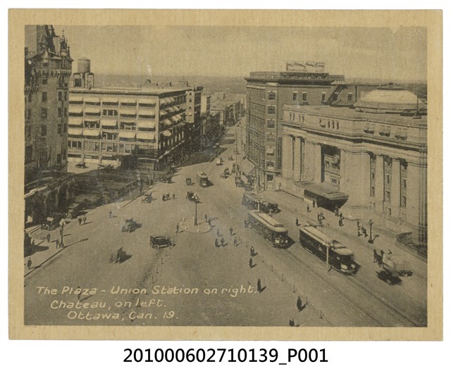 1. 本物件為渥太華聯合車站前廣場之黑白照。左方建物為聯合車站,車站前方有路面電車行駛。跨越電車軌道後為一三角形廣場。左方有一似城堡的建物。照片左下方印「The Plaza - Union Station on right Chateau, on left. Ottawa, Can. 19.」。2. 聯邦車站是自西元1913年開始興建的,耗時17年才完工,火車站前有中央廊柱,後有88英呎高的購票大廳。