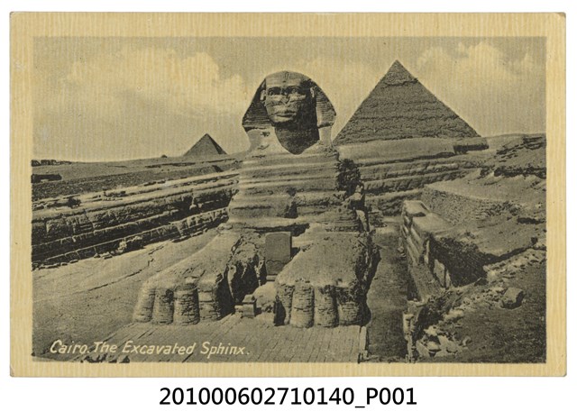 1. 本物件為人面獅身像之黑白照。中央主體為人面獅身像的正面,右後方為卡夫拉金字塔,左後方則是孟卡拉金字塔。照片左下方印「Cairo. The Excavated Sphinx.」。2. 吉薩金字塔區位於埃及開羅郊區的吉薩高原,主要有古夫金字塔、卡夫拉金字塔與孟卡拉金字塔。古夫金字塔(或翻譯為胡夫金字塔)興建於西元前4500年,是第四王朝的法老古夫建造的,該金字塔四個邊側面對應東南西北四方,底座為正四方形,其是金字塔群中最古老與最巨大的;卡夫拉金字塔,卡夫卡為古夫的兒子,卡夫卡金字塔體積較古夫金字塔小,在其正前方有著獅身人面像;孟卡拉金字塔體積為古夫金字塔的十分之一,是由法老孟卡拉與其繼承者建造完工的。