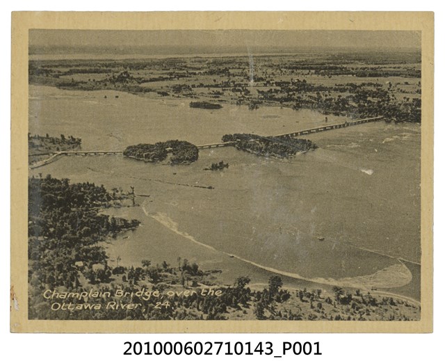 本物件為加拿大尚普蘭橋之黑白照。尚普蘭橋總長度為1.1公里,為跨越渥太華河最長的橋樑,中間穿越貝特島、坎寧安島、里奧佩勒島等三個小島(由右至左)。照片左下方印「Champlain Bridge, over the Ottawa River, 24.」。