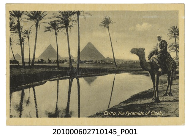 1. 本物件為吉薩金字塔群之黑白照。右側有一騎乘駱駝的旅人停留在岸邊,河岸兩旁均種有椰棗樹,遠方可見由三座金字塔組成的吉薩金字塔群。照片右下方印「Cairo. The Pyramids of Gizeh.」。2. 吉薩金字塔區位於埃及開羅郊區的吉薩高原,主要有古夫金字塔、卡夫拉金字塔與孟卡拉金字塔。古夫金字塔(或翻譯為胡夫金字塔)興建於西元前4500年,是第四王朝的法老古夫建造的,該金字塔四個邊側面對應東南西北四方,底座為正四方形,其是金字塔群中最古老與最巨大的;卡夫拉金字塔,卡夫卡為古夫的兒子,卡夫卡金字塔體積較古夫金字塔小,在其正前方,有著獅身人面像;孟卡拉金字塔體積為古夫金字塔的十分之一,是由法老孟卡拉與其繼承者建造完工的。