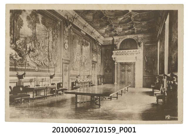 1. 本物件為尚蒂伊城堡之黑白照。該房間天花板飾有八邊形飾紋,中央有一大桌,左右兩側放置有不同樣式的椅子。左方牆面有大幅畫作,大門及牆面近天花板處有鹿與鹿角裝飾。2. 尚蒂伊城堡(Château de Chantilly)位於法國巴黎,現今為美術館。尚蒂伊城堡建於中世紀,其歷經各個領主更替,與法國歷史息息相關。