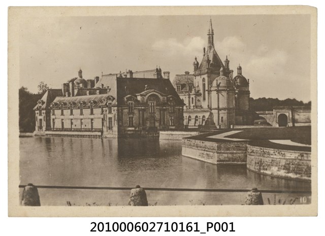 1. 本物件為尚蒂伊城堡之黑白照。右方建物為大城堡,左方建物為小城堡,城堡旁為平靜無波的水面。照片右下角印「10」。2. 尚蒂伊城堡(Château de Chantilly)位於法國巴黎,現今為美術館。尚蒂伊城堡建於中世紀,其歷經各個領主更替,與法國歷史息息相關。