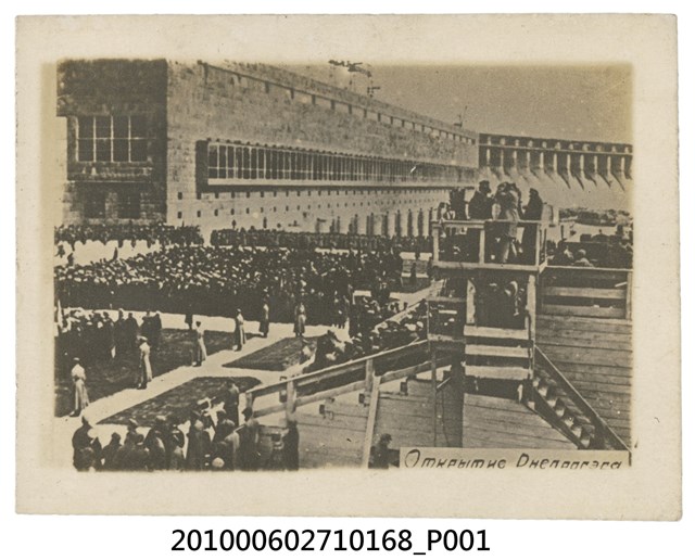 1. 本物件為第聶伯河水電站運行紀念之黑白照。第聶伯河發源俄羅斯的瓦爾代,第聶伯水電站則為第聶伯河上最大之水電站,於西元1932年啟用,有許多人到場參觀,可見著長大衣、著軍帽的軍警人員維持秩序。最右側為洩洪道,中間則是水力發電廠。照片右下方有俄文說明。2. 第聶伯河,為歐洲第三大河,其源自於俄羅斯瓦爾代丘陵南麓,流經白俄羅斯東部及烏克蘭中部,最後流入黑海聶伯灣,全長2200公里,流域面積為50.4萬平方公里,第聶伯河習慣被分為上第聶伯河與下第聶伯河。聶伯河以其水壩著名,建有克烈緬楚格、第聶伯、卡涅夫、第聶伯羅捷爾任斯克與卡霍夫卡、基輔等六座水電站。