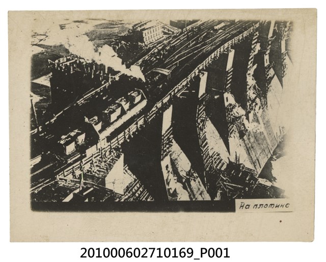 1. 本物件為第聶伯河水電站之黑白照。照片為第聶伯河水電站大壩施工的情形,建築主體為水壩洩洪道的部分,可見尚有許多地方架設著鷹架。照片右下方有俄文說明。2. 第聶伯河,為歐洲第三大河,其源自於俄羅斯瓦爾代丘陵南麓,流經白俄羅斯東部及烏克蘭中部,最後流入黑海聶伯灣,全長2200公里,流域面積為50.4萬平方公里,第聶伯河習慣被分為上第聶伯河與下第聶伯河。聶伯河以其水壩著名,建有克烈緬楚格、第聶伯、卡涅夫、第聶伯羅捷爾任斯克與卡霍夫卡、基輔等六座水電站。