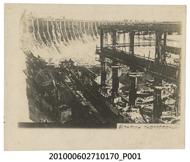1. 本物件為第聶伯河水電站之黑白照。照片為第聶伯河水電站大壩施工的情形,建築主體為水壩洩洪道的部分,可見尚有許多地方架設著鷹架。照片右下方有俄文說明。2. 第聶伯河,為歐洲第三大河,其源自於俄羅斯瓦爾代丘陵南麓,流經白俄羅斯東部及烏克蘭中部,最後流入黑海聶伯灣,全長2200公里,流域面積為50.4萬平方公里,第聶伯河習慣被分為上第聶伯河與下第聶伯河。聶伯河以其水壩著名,建有克烈緬楚格、第聶伯、卡涅夫、第聶伯羅捷爾任斯克與卡霍夫卡、基輔等六座水電站。
