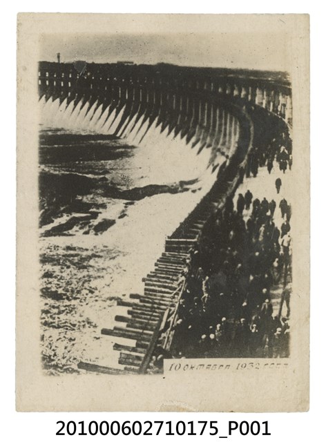 1.本物件為第聶伯水電站之黑白照。右方為第聶伯大壩洩洪道正在洩洪,大壩洩洪度長度近達800公尺。照片右下方有俄文說明。2.第聶伯河,為歐洲第三大河,其源自於俄羅斯瓦爾代丘陵南麓,流經白俄羅斯東部及烏克蘭中部,最後流入黑海聶伯灣,全長2200公里,流域面積為50.4萬平方公里,第聶伯河習慣被分為上第聶伯河與下第聶伯河。聶伯河以其水壩著名,建有克烈緬楚格、第聶伯、卡涅夫、第聶伯羅捷爾任斯克與卡霍夫卡、基輔等六座水電站。