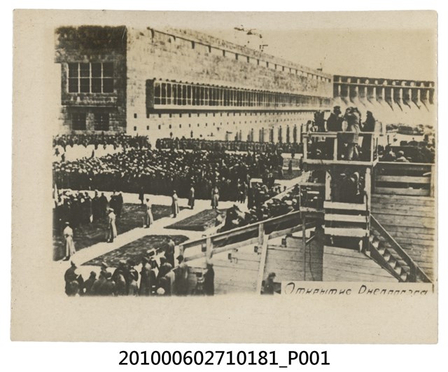 1.本物件為第聶伯河水電站運行紀念之黑白照片,畫面中可見左側遠景建築體,其為第聶伯河水電站之建物,畫面右側可見大壩,畫面近景則可見人影,道路一側亦有人員站哨。