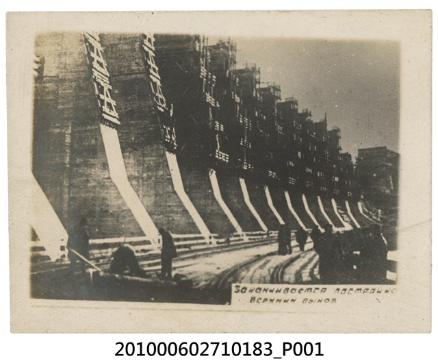 1.本物件為第聶伯河水電站大壩施工紀錄之黑白照片,畫面中可見左側高聳大壩,近景看似有工人施工,此景位於第聶伯河水電站。