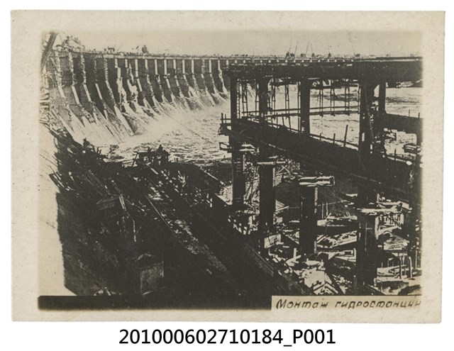 1. 本物件為第聶伯河水電站之黑白照。照片後方為水壩壩體,前方為興建中的水電站,僅建構出主體結構,牆面與地面均尚未建造。照片右下方有俄文說明。2. 第聶伯河,為歐洲第三大河,其源自於俄羅斯瓦爾代丘陵南麓,流經白俄羅斯東部及烏克蘭中部,最後流入黑海聶伯灣,全長2200公里,流域面積為50.4萬平方公里,第聶伯河習慣被分為上第聶伯河與下第聶伯河。聶伯河以其水壩著名,建有克烈緬楚格、第聶伯、卡涅夫、第聶伯羅捷爾任斯克與卡霍夫卡、基輔等六座水電站。