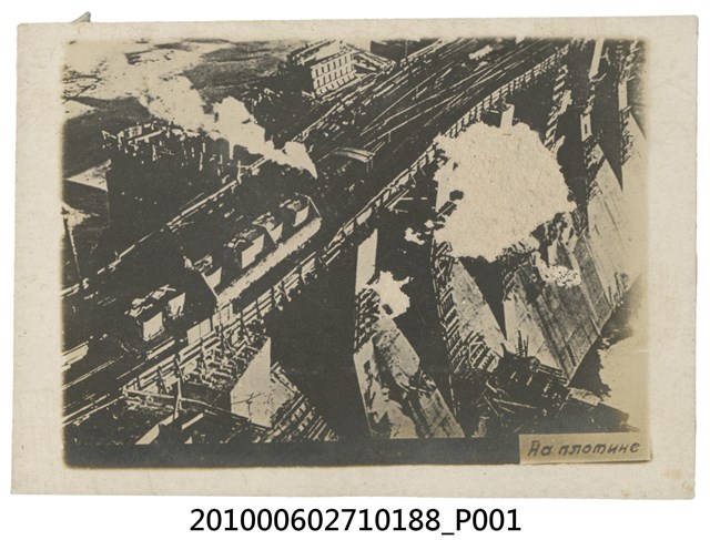 1. 本物件為第聶伯河水電站之黑白照。照片為第聶伯河水電站大壩施工的情形,建築主體為水壩洩洪道的部分,可見尚有許多地方架設著鷹架。照片中偏左處有大片白色毀損。照片右下方有俄文說明。2. 第聶伯河,為歐洲第三大河,其源自於俄羅斯瓦爾代丘陵南麓,流經白俄羅斯東部及烏克蘭中部,最後流入黑海聶伯灣,全長2200公里,流域面積為50.4萬平方公里,第聶伯河習慣被分為上第聶伯河與下第聶伯河。聶伯河以其水壩著名,建有克烈緬楚格、第聶伯、卡涅夫、第聶伯羅捷爾任斯克與卡霍夫卡、基輔等六座水電站。