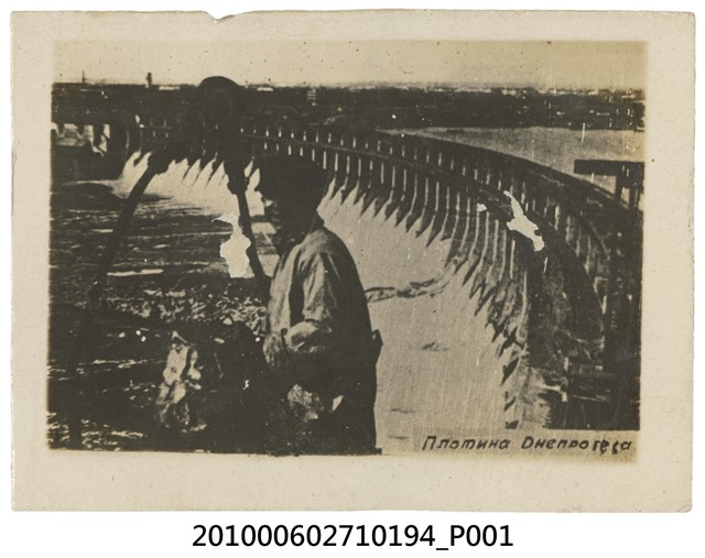 1. 本物件為第聶伯河水電站之黑白照。照片前方有一名男子,手持一似背包物,面對鏡頭露出微笑。後方為正在洩洪之第聶伯河大壩。照片右下方有俄文說明。2. 第聶伯河,為歐洲第三大河,其源自於俄羅斯瓦爾代丘陵南麓,流經白俄羅斯東部及烏克蘭中部,最後流入黑海聶伯灣,全長2200公里,流域面積為50.4萬平方公里,第聶伯河習慣被分為上第聶伯河與下第聶伯河。聶伯河以其水壩著名,建有克烈緬楚格、第聶伯、卡涅夫、第聶伯羅捷爾任斯克與卡霍夫卡、基輔等六座水電站。
