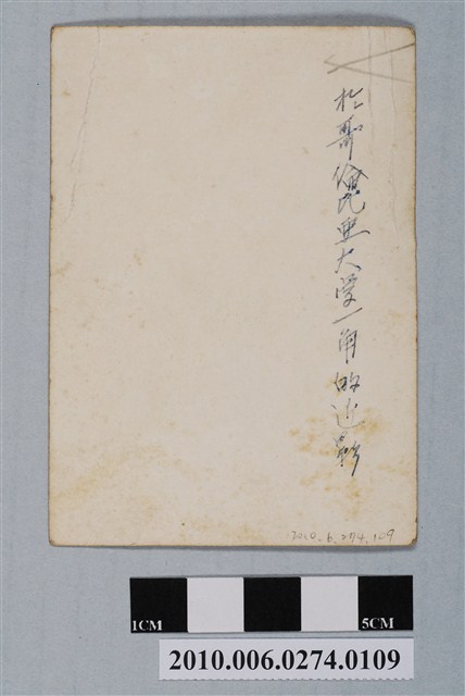 1. 本物件為男子於哥倫比亞大學校園獨照,正面為1名男子泛黃黑白照片,照片中有1名戴著眼睛的短髮男子站在草地上,穿著方格紋樣式的成套西裝,並繫有領帶,左手放在身側,右手則放在旁邊疑似腳架的物體,上方有1座高壓電塔,以及7條左右的電線,並有1棟方型外觀的建築物,建築物兩邊各種有1棵棕櫚科植物,照片背面右側位置以深藍色標有「於哥倫比亞大学一角的近影」。2. 紐約哥倫比亞大學創立於西元1756年,創校時期名稱為「國王學院」,在1776年美國宣布獨立之後,為了紀念哥倫布發現美洲,因此改名為「哥倫比亞學院」,後來於1912年改制,成為綜合性4年制的哥倫比亞大學。