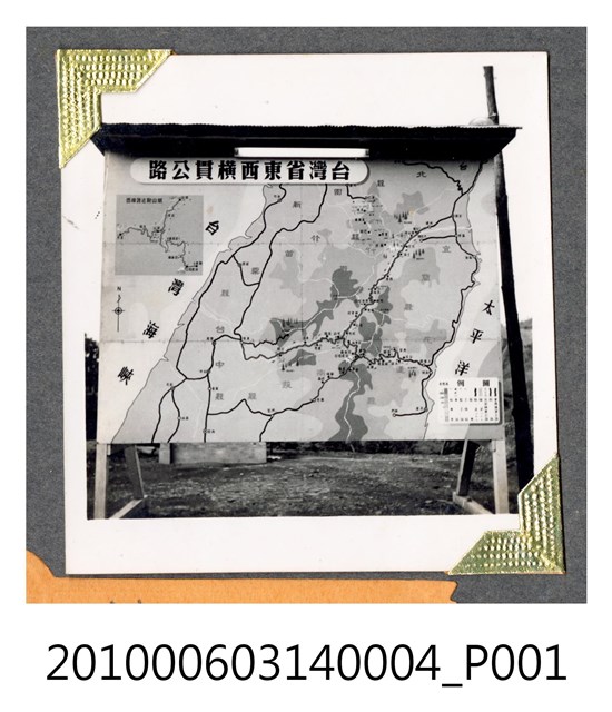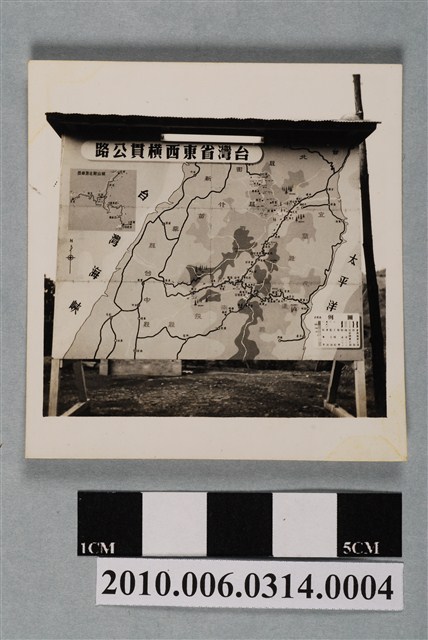 1.本物件東西橫貫公路地圖照片,地圖兩側以兩根三角木架支撐,上方建有遮雨棚。地圖中央繪製中橫主線及宜蘭、霧社兩支線重要據點;右下角繪製圖例;左上角覆蓋扁橢圓框,框內自右而左書寫「台灣省東西橫貫公路」等字,字的下方繪製梨山附近路線放大圖。2.東西橫貫公路又稱中部橫貫公路,簡稱中橫,西起臺中東勢,東至花蓮太魯閣,公路編號臺8線。其早期是原住民的狩獵路徑,日治時期將有些路段開闢為「理蕃道路」,至日治末期,部分道路可通行汽車。戰後,政府在美援支援下,決定建立東西線橫貫道路工程。1951年開始進行初勘,1956年6月完成探勘;同年7月自東、西兩端同時開工,由臺灣省公路局成立的「橫貫公路工程總處」負責工程事宜,實際由行政院國軍退除役官兵就業輔導委員會的榮民工程總隊及工兵、步兵,以及部分軍事犯、民工為施工主力,1960年5月通車,全長190餘公里。除主線外,另興建梨山至宜蘭的宜蘭支線(臺7甲),大禹嶺至霧社的霧社支線(臺14甲)。
