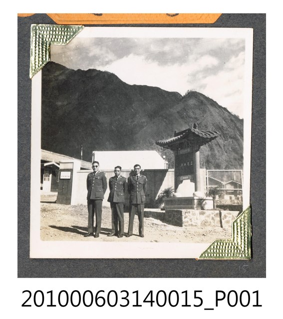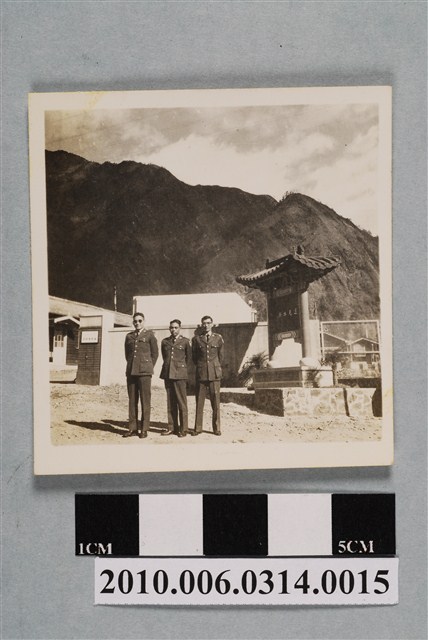 1.本物件為3人合照。照片中3人均著軍官服,站立於中間偏左處。照片偏右處中間為建有宮殿頂的地名指示牌,指示牌由右而左有「達見水庫」4字。照片左側的大門及建築,屬臺灣電力公司達見工程處。遠處可見高山、山谷樣貌,山下可見木構建築。2.達見水庫位於大甲溪上游,係於1969年12月動工興建,由臺灣電力公司達見工程處負責工程執行,1973年12月開始蓄水,1974年9月全部完工。完工後,時任總統蔣中正改名為「德基水庫」。