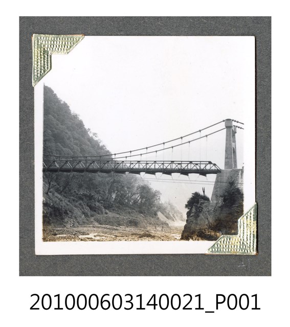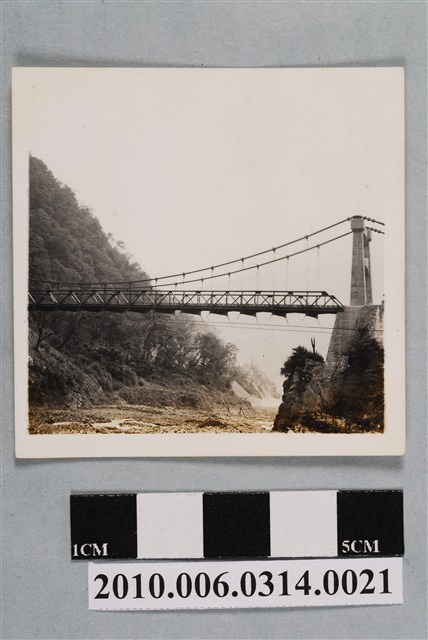 1.本物件為可法橋吊橋的照片,照片最右處可見橋塔,橋身自右往左橫貫。照片左側為山景;橋下方為河谷。照片背面用鉛筆書寫「宜支線可法橋」。2.可法橋位於東西橫貫公路宜蘭支線,跨米摩登溪。東西橫貫公路又稱中部橫貫公路,簡稱中橫,西起臺中東勢,東至花蓮太魯閣,公路編號臺8線。其早期是原住民的狩獵路徑,日治時期將有些路段開闢為「理蕃道路」,至日治末期,部分道路可通行汽車。戰後,政府在美援支援下,決定建立東西線橫貫道路工程。1951年開始進行初勘,1956年6月完成探勘;同年7月自東、西兩端同時開工,由臺灣省公路局成立的「橫貫公路工程總處」負責工程事宜,實際由行政院國軍退除役官兵就業輔導委員會的榮民工程總隊及工兵、步兵,以及部分軍事犯、民工為施工主力,1960年5月通車,全長190餘公里。除主線外,另興建梨山至宜蘭的宜蘭支線(臺7甲),大禹嶺至霧社的霧社支線(臺14甲)。其中宜蘭支線起點原在羅東,終點在梨山,連接中橫本線。1966年北部橫貫公路通車後,起點改在宜蘭縣大同鄉的百韜橋,全長約74公里。