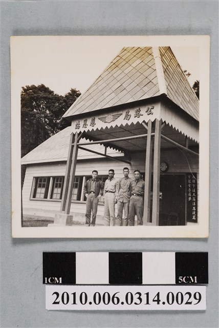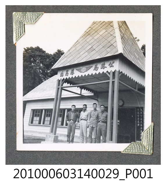 1.本物件為4人合照。照片中4人站立於車站門口前伸遮雨棚下,4人均穿長袖卡其軍裝,左1男子另在軍裝外再穿上外套。4人後方為車站門口,門口上懸掛時鐘,時刻為8時38分。車站為木造建築,大門前伸遮雨棚為三角柱體頂,頂棚前緣中央有公路局標誌,標誌右側由右而左有「公路局」3字,左側由右而左有「慈恩站」3字。照片背面用鉛筆書寫「花蓮梨山間中途站」等字。2.公路局隸屬省政府,除負責道路施工養護外,戰後前期尚擔負長途客運運輸任務。民國69年,臺灣省公路局改組,將公路客運業務獨立設立臺灣汽車客運公司,仍歸省營。民國90年,臺汽民營化,改組為國光客運至今。