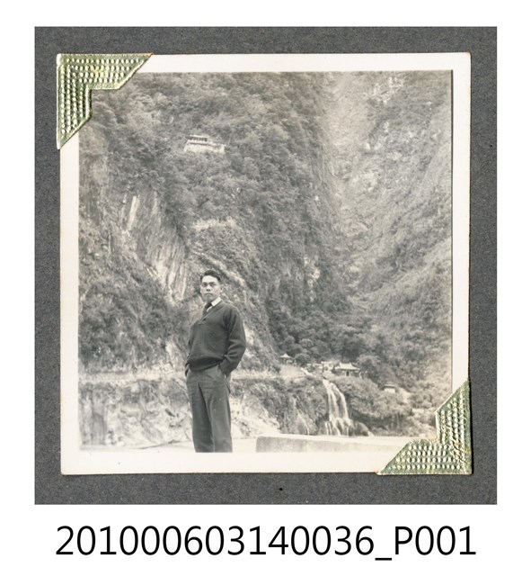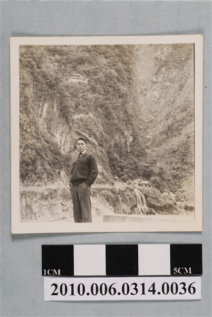 1.本物件為男子獨照,男子站立於近景偏左處,身穿長袖背心,雙手插在口袋,側身面對鏡頭。男子背後為立霧溪河谷,河的對岸為山壁,山壁下方為長春祠步道,步道右端建築為長春祠,長春祠下方有瀑布;山壁左上的建築為禪光寺。2.長春祠位於東西橫貫公路東段,是為奉祀開闢中橫公路因公殉職的225位工程人員靈位而興建。東西橫貫公路又稱中部橫貫公路,簡稱中橫,西起臺中東勢,東至花蓮太魯閣,公路編號臺8線。其早期是原住民的狩獵路徑,日治時期將有些路段開闢為「理蕃道路」,至日治末期,部分道路可通行汽車。戰後,政府在美援支援下,決定建立東西線橫貫道路工程。1951年開始進行初勘,1956年6月完成探勘;同年7月自東、西兩端同時開工,由臺灣省公路局成立的「橫貫公路工程總處」負責工程事宜,實際由行政院國軍退除役官兵就業輔導委員會的榮民工程總隊及工兵、步兵,以及部分軍事犯、民工為施工主力,1960年5月通車,全長190餘公里。除主線外,另興建梨山至宜蘭的宜蘭支線(臺7甲),大禹嶺至霧社的霧社支線(臺14甲)。