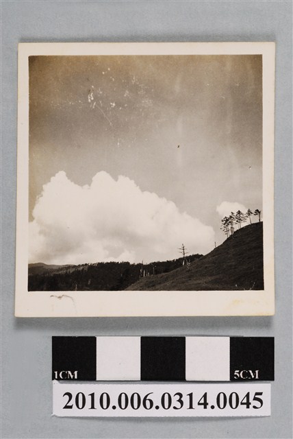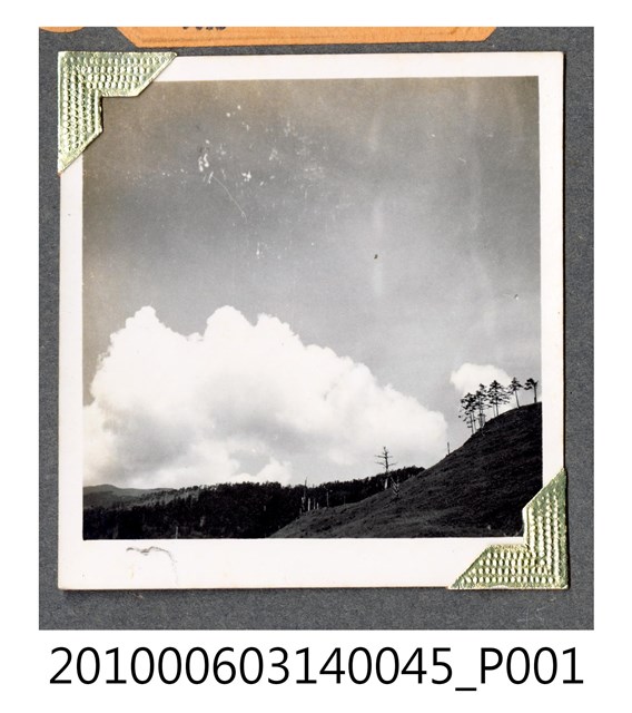 1.本物件為合歡山頂風景照片。照片下方近景為高山,左側有1處草坡。照片上半部為天空,中央有雲。照片背面用鉛筆書寫「合歡山頂美麗的雲」等字。2.合歡山主峰海拔3417公尺,位於東西橫貫公路霧社支線旁。日治時期霧社支線原為「合歡越道路」部分路段。戰後隨中橫主線工程動工而興建,因公路興築是為因應中橫工程所需,故初名霧社供應線。1958年5月7日全線通車,起自南投縣霧社,終點在中橫主線的大禹嶺,全長約42公里,道路編號臺14甲線。