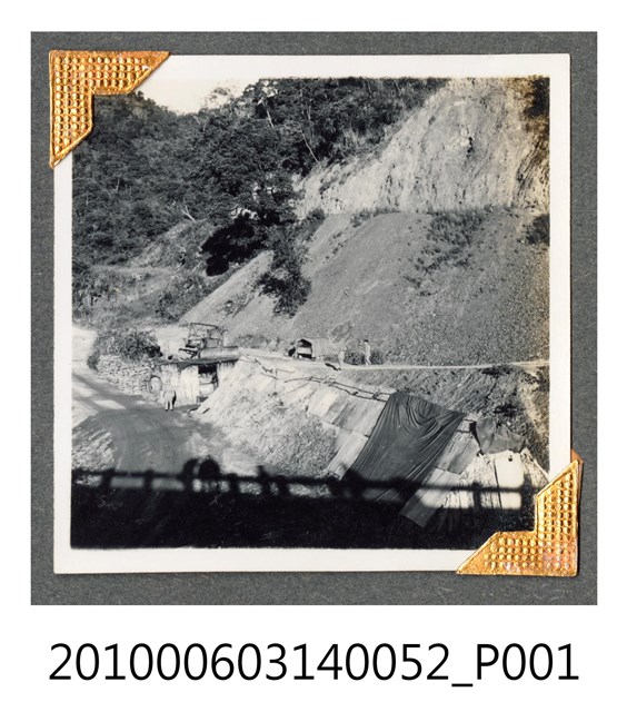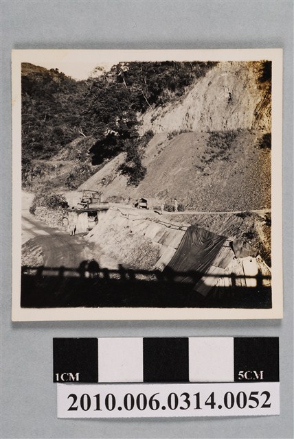 1.本物件為中橫路段的照片,照片可見道路在左側形成髮夾彎,髮夾彎處下方有1間簡易工寮,工寮前有1名軍人全副武裝守衛,工寮上方有1臺推土機。上方路段有兩人正在站立或行走。道路上方為崩坡景象。2.東西橫貫公路又稱中部橫貫公路,簡稱中橫,西起臺中東勢,東至花蓮太魯閣,公路編號臺8線。其早期是原住民的狩獵路徑,日治時期將有些路段開闢為「理蕃道路」,至日治末期,部分道路可通行汽車。戰後,政府在美援支援下,決定建立東西線橫貫道路工程。1951年開始進行初勘,1956年6月完成探勘;同年7月自東、西兩端同時開工,由臺灣省公路局成立的「橫貫公路工程總處」負責工程事宜,實際由行政院國軍退除役官兵就業輔導委員會的榮民工程總隊及工兵、步兵,以及部分軍事犯、民工為施工主力,1960年5月通車,全長190餘公里。除主線外,另興建梨山至宜蘭的宜蘭支線(臺7甲),大禹嶺至霧社的霧社支線(臺14甲)。