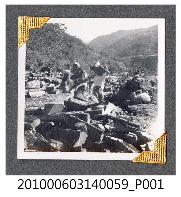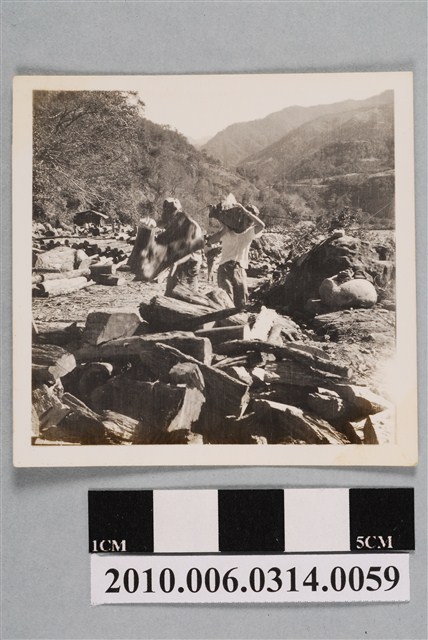 1.本物件為中橫施工的照片,照片主景是1處滿布木頭的山谷地,近景左側有1名穿軍服的軍人正在搬運木頭,右方亦有1人著內衣扛木頭;遠處可見多人正在行走或工作;照片左側遠處有1間木屋,右側遠處有1座吊橋橫貫。2.東西橫貫公路又稱中部橫貫公路,簡稱中橫,西起臺中東勢,東至花蓮太魯閣,公路編號臺8線。其早期是原住民的狩獵路徑,日治時期將有些路段開闢為「理蕃道路」,至日治末期,部分道路可通行汽車。戰後,政府在美援支援下,決定建立東西線橫貫道路工程。1951年開始進行初勘,1956年6月完成探勘;同年7月自東、西兩端同時開工,由臺灣省公路局成立的「橫貫公路工程總處」負責工程事宜,實際由行政院國軍退除役官兵就業輔導委員會的榮民工程總隊及工兵、步兵,以及部分軍事犯、民工為施工主力,1960年5月通車,全長190餘公里。除主線外,另興建梨山至宜蘭的宜蘭支線(臺7甲),大禹嶺至霧社的霧社支線(臺14甲)。
