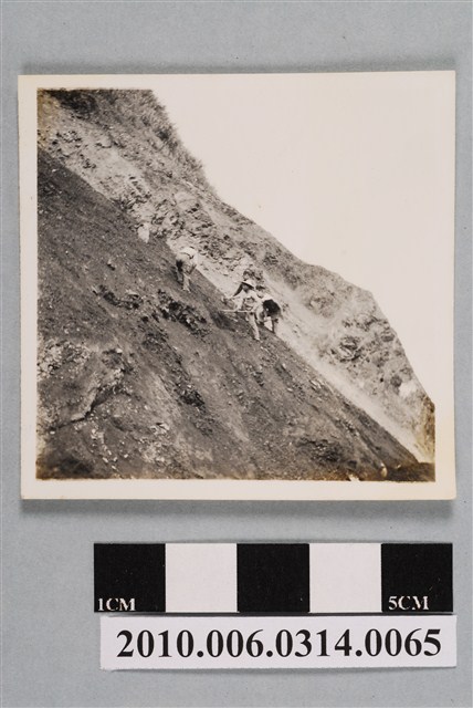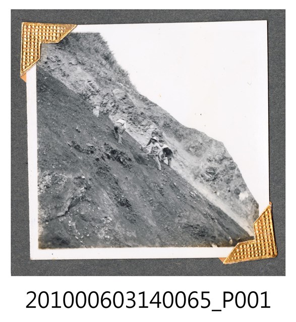 1.本物件為中橫施工的照片,照片主景是1處約45度的崩坡,呈左上右下下降。坡上無植被;崩坡上可見4名軍人正在工作。2.東西橫貫公路又稱中部橫貫公路,簡稱中橫,西起臺中東勢,東至花蓮太魯閣,公路編號臺8線。其早期是原住民的狩獵路徑,日治時期將有些路段開闢為「理蕃道路」,至日治末期,部分道路可通行汽車。戰後,政府在美援支援下,決定建立東西線橫貫道路工程。1951年開始進行初勘,1956年6月完成探勘;同年7月自東、西兩端同時開工,由臺灣省公路局成立的「橫貫公路工程總處」負責工程事宜,實際由行政院國軍退除役官兵就業輔導委員會的榮民工程總隊及工兵、步兵,以及部分軍事犯、民工為施工主力,1960年5月通車,全長190餘公里。除主線外,另興建梨山至宜蘭的宜蘭支線(臺7甲),大禹嶺至霧社的霧社支線(臺14甲)。