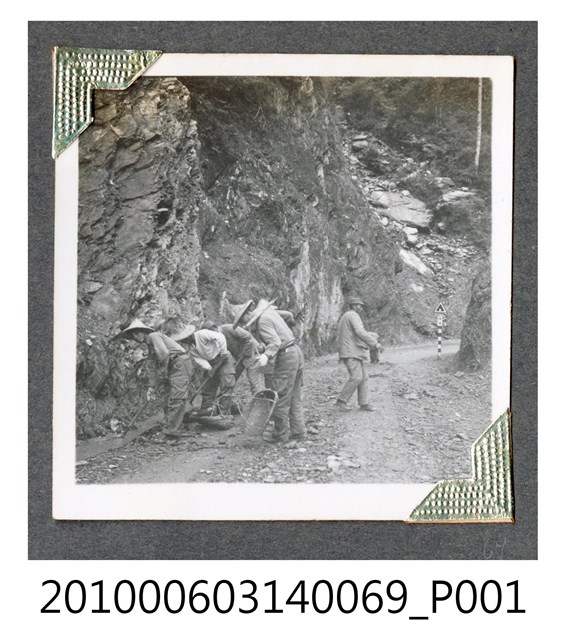 1.本物件為中橫施工的照片,照片地點是中橫衡山隧道附近路段。照片近景為道路,路徑至前方往右彎曲。照片左側為近乎垂直的陡壁,有4名頭戴斗笠、身穿長袖內衣的軍人正在清理路旁的窪地積水,另有1人頭戴軍帽往右方行走。道路轉彎處右側有1個「隧道」的交通標誌;轉彎處側面為傾斜的崩坡。2.衡山隧道地處中橫公路東段新白楊至洛韶間。東西橫貫公路又稱中部橫貫公路,簡稱中橫,西起臺中東勢,東至花蓮太魯閣,公路編號臺8線。其早期是原住民的狩獵路徑,日治時期將有些路段開闢為「理蕃道路」,至日治末期,部分道路可通行汽車。戰後,政府在美援支援下,決定建立東西線橫貫道路工程。1951年開始進行初勘,1956年6月完成探勘;同年7月自東、西兩端同時開工,由臺灣省公路局成立的「橫貫公路工程總處」負責工程事宜,實際由行政院國軍退除役官兵就業輔導委員會的榮民工程總隊及工兵、步兵,以及部分軍事犯、民工為施工主力,1960年5月通車,全長190餘公里。除主線外,另興建梨山至宜蘭的宜蘭支線(臺7甲),大禹嶺至霧社的霧社支線(臺14甲)。