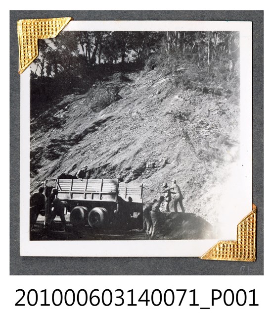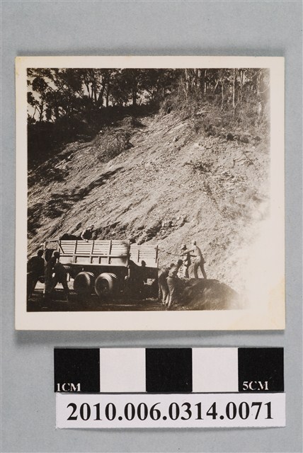1.本物件為中橫施工的照片,照片地點在中橫衡山隧道附近路段。照片主景為1處崩坡,崩坡下方停放1輛軍用卡車,卡車車頭朝向左方;車尾右側有碎石堆,有4名頭戴軍帽、著軍服的軍人正在將碎石鏟入卡車車斗;卡車靠近車頭處另有3人在工作。照片背面鉛筆書寫「遢方碎石裝運」等字。2.衡山隧道地處中橫公路東段新白楊至洛韶間。東西橫貫公路又稱中部橫貫公路,簡稱中橫,西起臺中東勢,東至花蓮太魯閣,公路編號臺8線。其早期是原住民的狩獵路徑,日治時期將有些路段開闢為「理蕃道路」,至日治末期,部分道路可通行汽車。戰後,政府在美援支援下,決定建立東西線橫貫道路工程。1951年開始進行初勘,1956年6月完成探勘;同年7月自東、西兩端同時開工,由臺灣省公路局成立的「橫貫公路工程總處」負責工程事宜,實際由行政院國軍退除役官兵就業輔導委員會的榮民工程總隊及工兵、步兵,以及部分軍事犯、民工為施工主力,1960年5月通車,全長190餘公里。除主線外,另興建梨山至宜蘭的宜蘭支線(臺7甲),大禹嶺至霧社的霧社支線(臺14甲)。