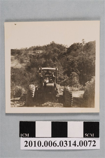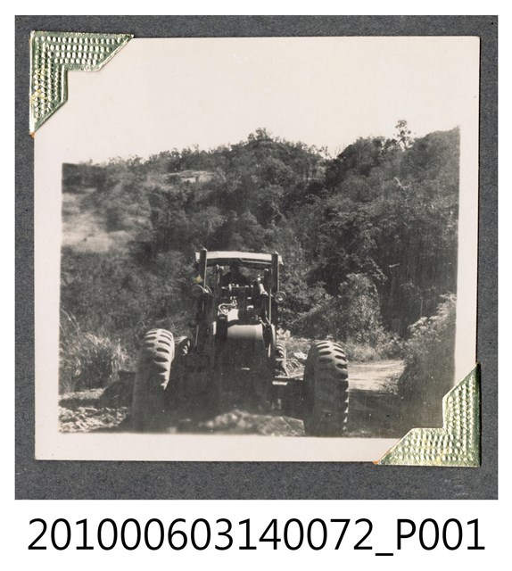1.本物件為中橫施工的照片,照片近景道路佈滿碎石,1輛工程車正開在碎石道路上;遠景道路則已清空。道路左側是草木扶疏的山坡。2.東西橫貫公路又稱中部橫貫公路,簡稱中橫,西起臺中東勢,東至花蓮太魯閣,公路編號臺8線。其早期是原住民的狩獵路徑,日治時期將有些路段開闢為「理蕃道路」,至日治末期,部分道路可通行汽車。戰後,政府在美援支援下,決定建立東西線橫貫道路工程。1951年開始進行初勘,1956年6月完成探勘;同年7月自東、西兩端同時開工,由臺灣省公路局成立的「橫貫公路工程總處」負責工程事宜,實際由行政院國軍退除役官兵就業輔導委員會的榮民工程總隊及工兵、步兵,以及部分軍事犯、民工為施工主力,1960年5月通車,全長190餘公里。除主線外,另興建梨山至宜蘭的宜蘭支線(臺7甲),大禹嶺至霧社的霧社支線(臺14甲)。