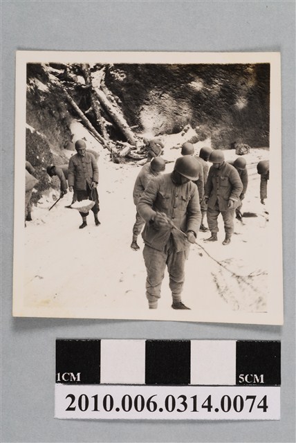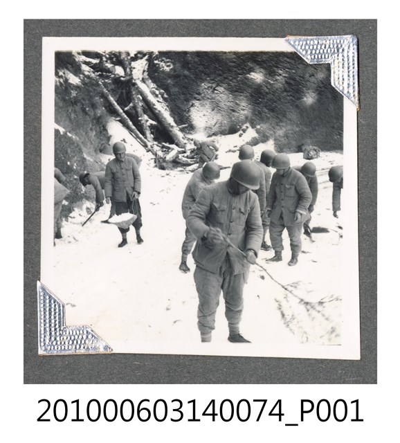 1.本物件為中橫施工的照片,照片主景為積雪道路,道路左側為山坡。照片中共有12人,頭戴鋼盔,身穿厚外套,正在清理積雪。2.東西橫貫公路又稱中部橫貫公路,簡稱中橫,西起臺中東勢,東至花蓮太魯閣,公路編號臺8線。其早期是原住民的狩獵路徑,日治時期將有些路段開闢為「理蕃道路」,至日治末期,部分道路可通行汽車。戰後,政府在美援支援下,決定建立東西線橫貫道路工程。1951年開始進行初勘,1956年6月完成探勘;同年7月自東、西兩端同時開工,由臺灣省公路局成立的「橫貫公路工程總處」負責工程事宜,實際由行政院國軍退除役官兵就業輔導委員會的榮民工程總隊及工兵、步兵,以及部分軍事犯、民工為施工主力,1960年5月通車,全長190餘公里。除主線外,另興建梨山至宜蘭的宜蘭支線(臺7甲),大禹嶺至霧社的霧社支線(臺14甲)。