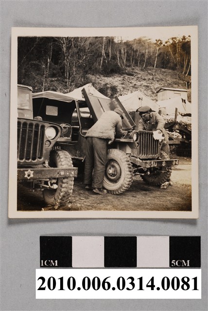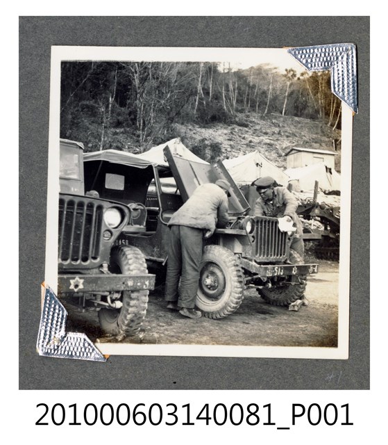 1.本物件為檢查軍車的照片,照片自左側到中央共停放兩輛吉普車,其中右方的吉普車車頭引擎蓋掀起,有兩名軍人正在檢查車況。照片背景為山坡,照片右半部山坡下可見1棟建築物及3個營帳。2.東西橫貫公路又稱中部橫貫公路,簡稱中橫,西起臺中東勢,東至花蓮太魯閣,公路編號臺8線。其早期是原住民的狩獵路徑,日治時期將有些路段開闢為「理蕃道路」,至日治末期,部分道路可通行汽車。戰後,政府在美援支援下,決定建立東西線橫貫道路工程。1951年開始進行初勘,1956年6月完成探勘;同年7月自東、西兩端同時開工,由臺灣省公路局成立的「橫貫公路工程總處」負責工程事宜,實際由行政院國軍退除役官兵就業輔導委員會的榮民工程總隊及工兵、步兵,以及部分軍事犯、民工為施工主力,1960年5月通車,全長190餘公里。除主線外,另興建梨山至宜蘭的宜蘭支線(臺7甲),大禹嶺至霧社的霧社支線(臺14甲)。