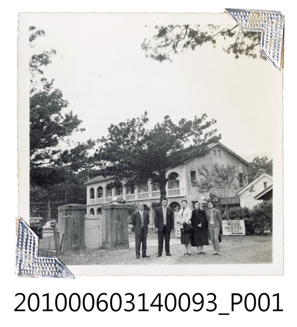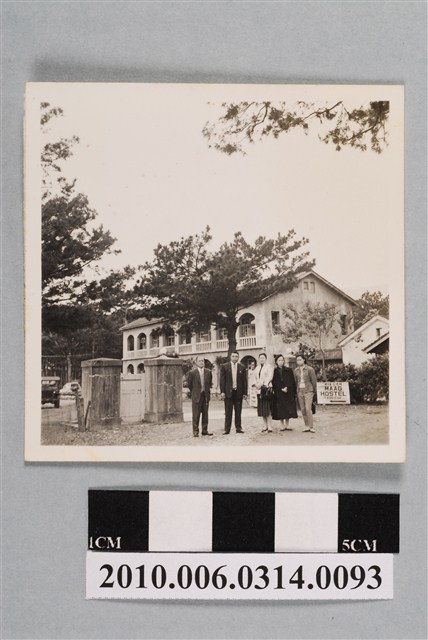 1.本物件為5人合照,照片中兩名男子站立於左側,均著西裝、長褲、皮鞋,打領帶;3名女子站立於右側。5人背後為大門,大門內庭園有1棵松樹,松樹後方為1棟兩層樓仿洋式拱廊建築,為美軍顧問團軍官休閒渡假中心。大門右側尚可見1棟建築,大門右側立有告示牌,告示牌上以英文書寫「HUA-LIEN MAAG HOSTEL FASD.CSF ←」等字樣和符號,其中「HUA-LIEN」是花蓮音譯,MAAG是美軍顧問團Military Assistance Advisory Group之英文縮寫。照片最左隱約可見1輛吉普車。2.美軍顧問團軍官休閒渡假中心位於花蓮市美崙山麓,前身為日治末期1942年興建的花蓮港陸軍兵事部辦公室。戰後中華民國政府接收,曾作為兵工學校的理化實驗室。後美軍顧問團進駐臺灣,在1950年代後期改為美軍顧問團的軍官休閒渡假中心。1979年臺美斷交,此建築移撥給退輔會管理。目前開闢為松園別館,開放給民眾參觀。