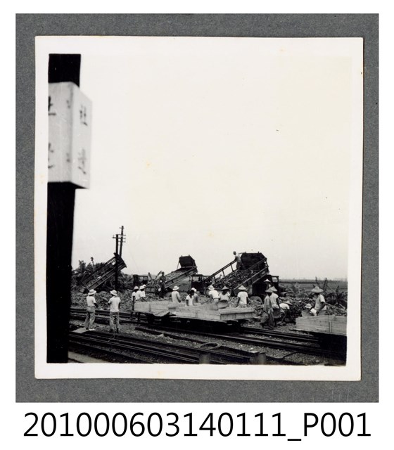 1.本物件為鐵路施工的照片,地點在屏東線。照片中央可見共有3輛軍用卡車正在傾倒車斗上的石頭。照片近景處有兩股鐵道,較遠1股鐵路上停著3臺簡易軌道車,軌道車和卡車間及鐵軌上有多人正在進行整理石頭工作。照片最左邊有1根柱子,柱子上方可見上下書寫「社邊」二字,顯示照片地點在社邊車站。