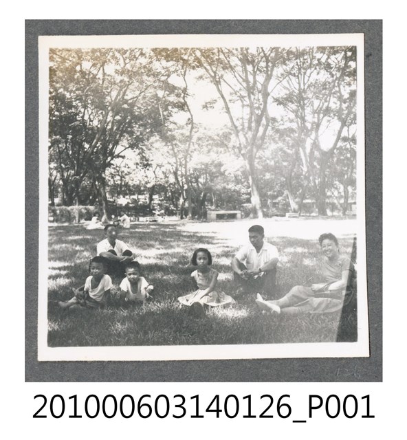 1.本物件為六人合照,地點在澄清湖內大草坪。照片近景為草地,兩名男童及1名男子坐於左半部;1名女童、女子、男子坐在右半部。左側遠處尚有兩人望向鏡頭;更遠處為樹林。