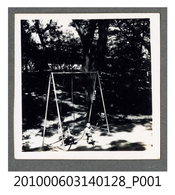 1.本物件為3名孩童側拍,地點在澄清湖內的兒童遊樂區。照片近景為1個鞦韆架,鞦韆架掛有2個鞦韆。1名女童1腳踏在左側鞦韆上;1名男童正在盪右邊的鞦韆;另1名男童在鞦韆前奔跑。鞦韆後方為樹林。樹林遠處可見1道白色有欄杆的圍牆。