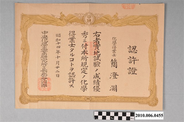 2010.006.0455 昭和14年簡澄淵化學得業士認可證書