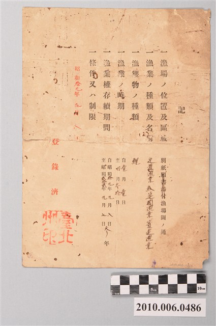 本件為昭和19年(1944)臺北州知事給予郭仁湖定置漁業許可證,昭和19年9月8日臺北州知事西村高兄發給臺北州七星郡士林街洲尾188番地郭仁湖的定置漁業許可證。背面記載漁業種類為定置漁業、魞簗類漁業、簀建漁業,漁獲物種類為鯉,捕魚的時間為1月1日至4月30日,漁業權從昭和19年9月8日至昭和22年(1947)9月7日共3年。
