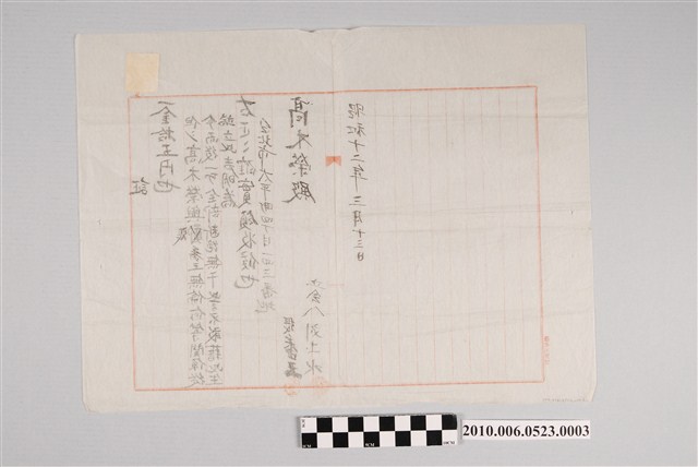 本件為昭和12年(1937)張番王給予高木榮斷絕關係之證明與收據,昭和12年3月13日臺北市太平町四丁目143番地之張番王,收到高木榮之15円,聲明從高木榮與張番王從今而後,一切斷絕關係。貼有印花稅票参錢一張。