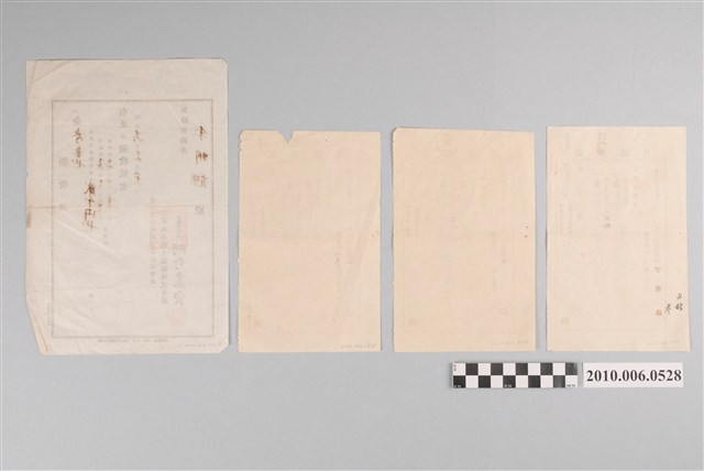 本件日治時期李氏家族收據四張,前三張為明治37年(1904)9月5日臺北廳錫口支廳給予李永□、李德茂、李永樹、李神祈繳納明治37年地租及附加稅之收據。第四張為昭和16年(1941)12月22日大成火災海上保險株式會社給予李明輝繳交火災保險費3圓之收據。