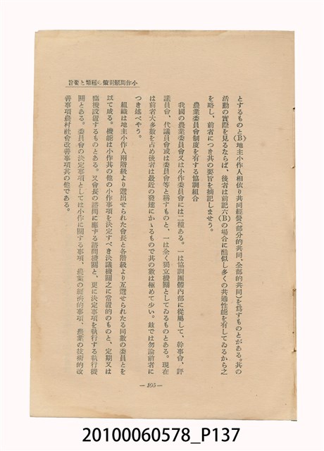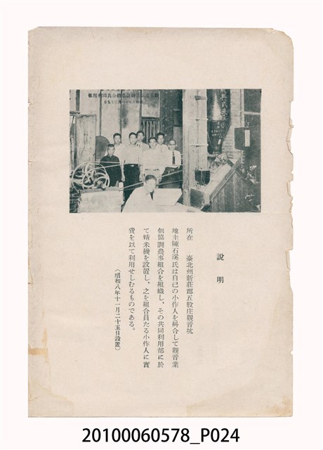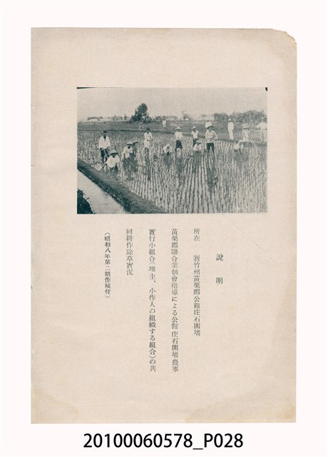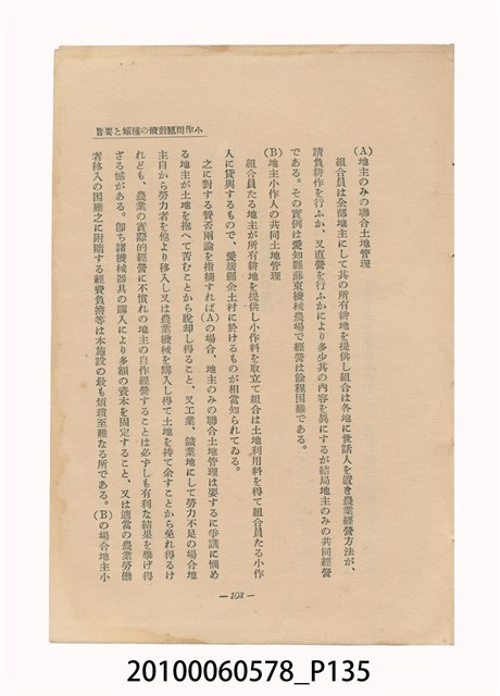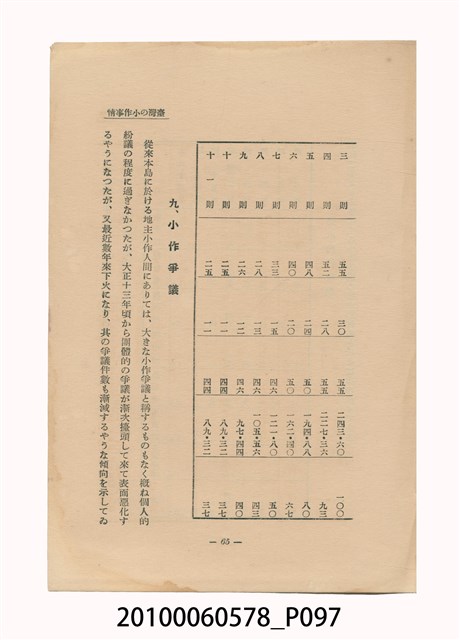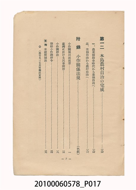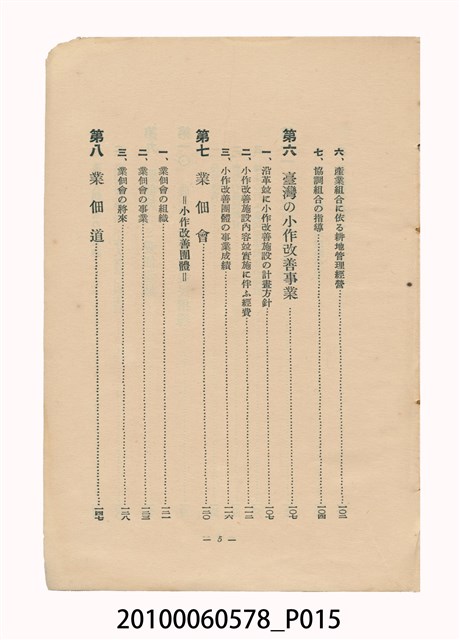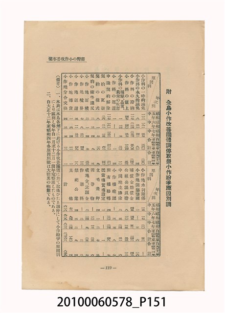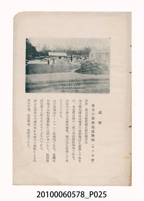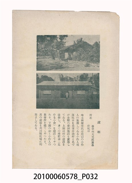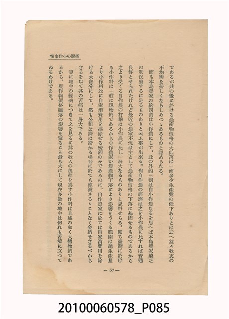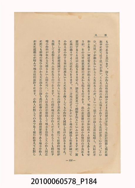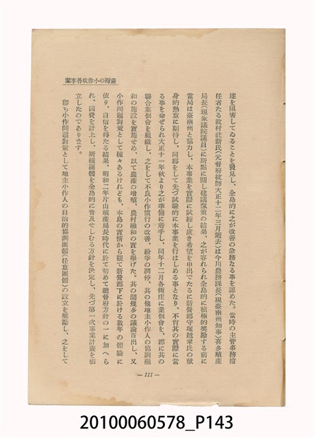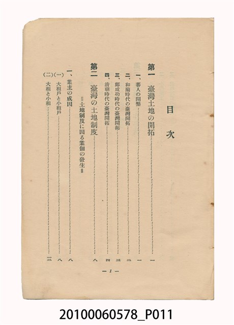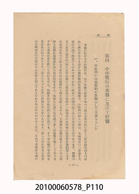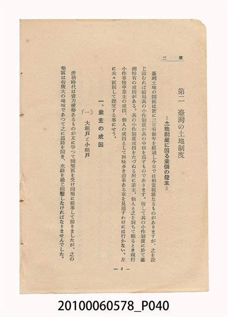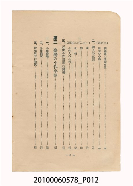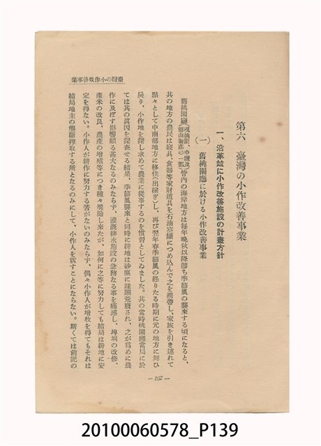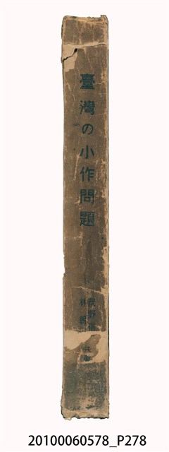 本物件為臺灣的小作問題,由茂野信一和林朝卿共同編著,吉村商會出版部於昭和8年12月25日發行。「小作」為佃農、自耕農之意。該書介紹臺灣農業問題及發展,包含臺灣土地的開墾與土地制度發展,大小租戶與佃農的形成,小作農業的發展與影響等。本件與登錄號2010.015.0093藏品相同。